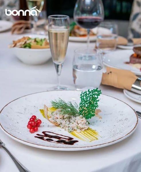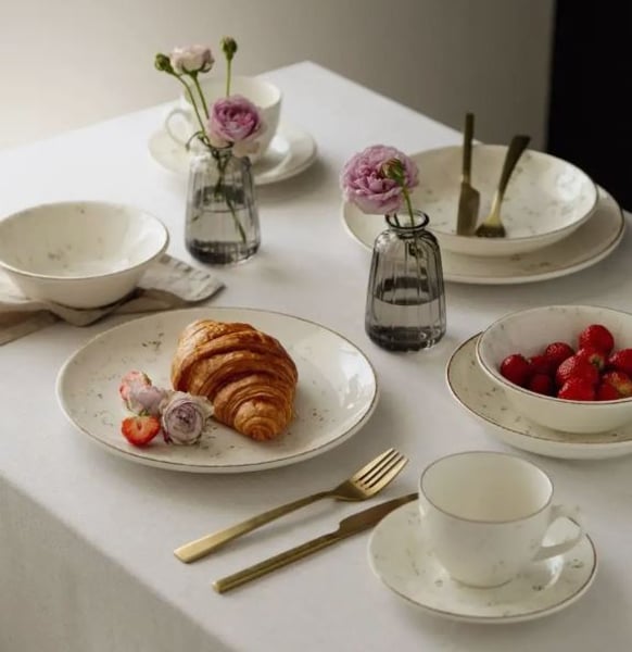 Колекція Bonna Grain – це колекція професійного порцелянового посуду, розписана вручну та доступна в оригінальному дизайні, який неодмінно привертатиме увагу при подачі. Колекція Bonna Grain представлена в білому кольорі у теплих відтінках з кавовим кантом та вкрапленнями: приємним поєднанням вершкового, коричневого, золотистого, чорного кольорів та ідеально підходить для сервірування столу в їдальні або кухні, у вітальні під час фуршету, в ресторані або кафе.