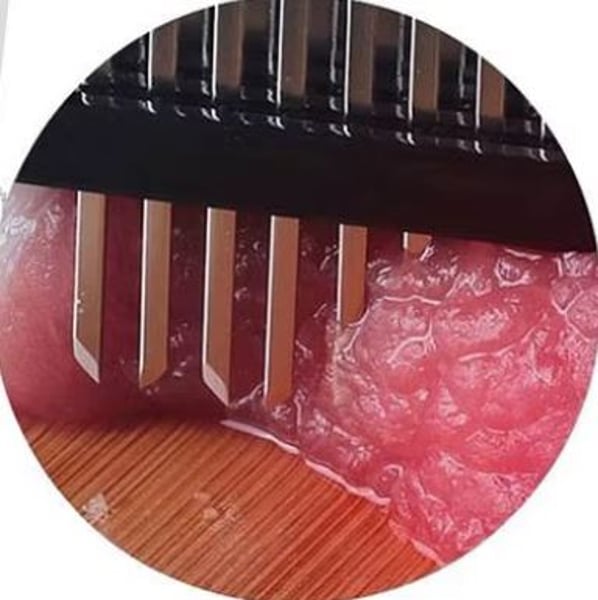 Тендерайзер для м'яса Hendi 843499 - легко відбиває м'ясо, пом'якшує волокнисту масу, одночасно зберігаючи форму м'яса. Пристрій поєднує у собі метод глибоких насічок волокон м'яса з одночасним легким відбиванням. Продукція Hendi відрізняється високою якістю та універсальністю, представлена модель рекомендована для використання на професійній кухні, її можна успішно використовувати і в домашніх умовах. Леза тендерайзера, виготовлені з нержавіючої сталі, висуваються під час удару в поверхню шматка м'яса, насікаючи його по всій товщині. Завдяки нашому тендерайзеру, час маринування скорочується на три чверті в порівнянні з традиційною обробкою м'яса. Час приготування, смаження, грилювання розпушеного м'яса скорочується майже на 50% і м'ясо значно менше уварюється.