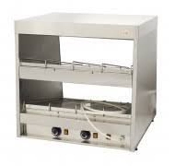 Теплова вітрина для бургерів виготовлена повністю з нержавіючої сталі, обладнана двома полицями, для кожного окреме регулювання температури. Є підсвічування та роздільники в полицях. Вітрина не обладнана дверцятами.