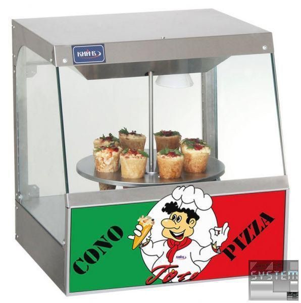 Теплова вітрина на 8 конусів готової піци. Зберігає піцу у гарячому вигляді свіжою та готовою до вживання якомога довше. При кімнатній температурі починають активно розмножуватися бактерії та мікроорганізми в будь-якій свіжоприготованій страві, які і приводять у непридатність їжі. Єдина можливість запобігти розмноженню бактерій та мікроорганізмів – постійно підтримувати температуру страви на досить високому рівні +80-90 °С або заморозити її.