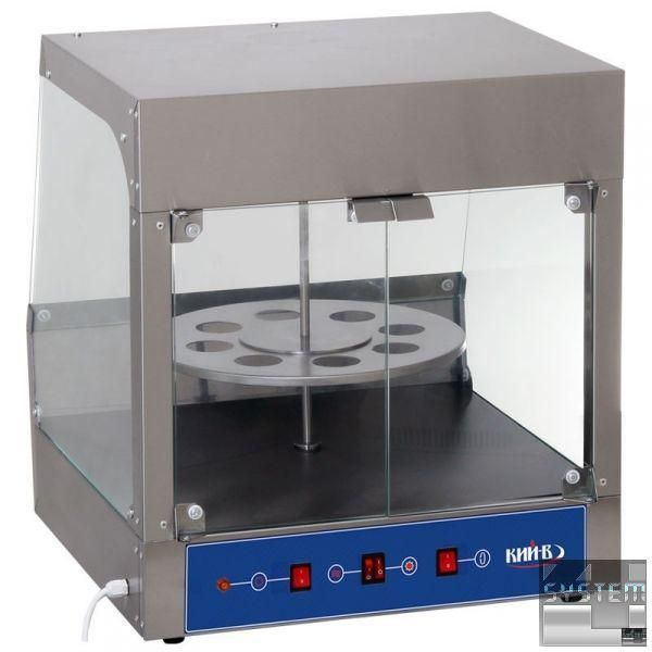 Настільна теплова вітрина для конусної піци призначена для тимчасового зберігання та презентації піци. Оснащена знімною підставкою, що обертається, термостатичним регулюванням температури, світловим індикатором нагріву. Для легкого та зручного доступу до продукції у вітрині з боку персоналу передбачені скляні дверцята.