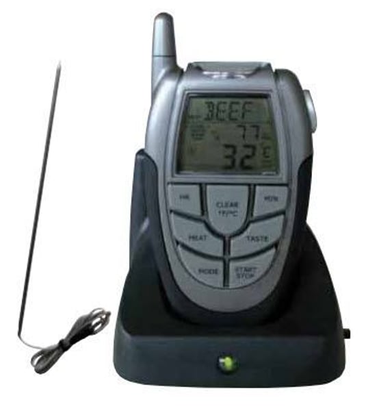 Цей термометр з дистанційним керуванням. Передавач має габарити: 100х60х35 мм. Приймач: 90х70х75 мм. Сенсор з нержавіючої сталі, що дозволяє легко мити інвентар: Ø 3,8 х 230 мм. Температурний режим: -10 ⁰С / +250 ⁰С. Довжина кабелю: 870 мм. В конструкцію входить: 4 варіанти вибору для 5 сортів м'яса: яловичини, телятини, свинини, курки, індички, 3 температурні режими на вибір та таймер, Звуковий сигнал, якщо досягнуто бажаного результату, температури або часу приготування. Упаковка має розміри: 245х75х75 мм