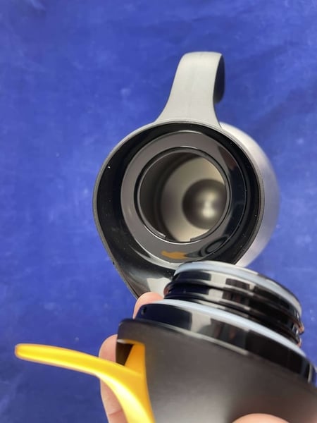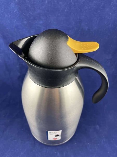 Термос виконаний із нержавіючої сталі, з подвійними стінками. Кришка з жовтою кнопкою та ручка з поліпропілену.