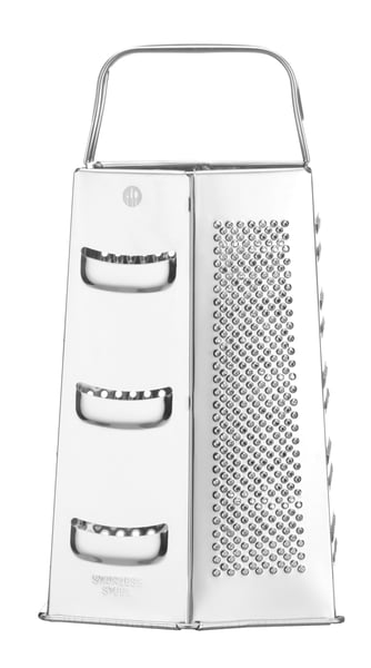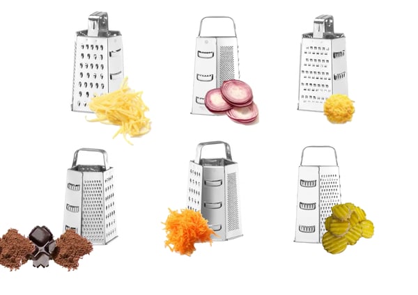 Тертка передбачає 6 робочих сторін з різним функціоналом: передбачено 4 варіанти натирання та 2 варіанти нарізки ломтиками.