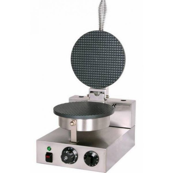 Корпус однопостової електрофавельниці виконаний з нержавіючої сталі, а робоча поверхня для приготування вафель з чавуну та антрипригарного покриття. Форма вафель кругла та тонка діаметром на 210мм. Малюнок 7х7 мм. Час випікання швидкого кондитерського виробу від 2-4 хвилин. Потужність 1,20 кВт, таймер - 5 хвилин.
