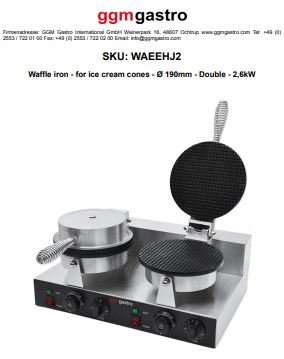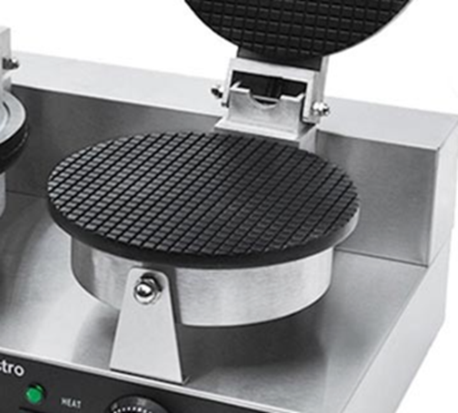 Двопостова вафельниця призначена для випічки тонких вафель круглої форми. За допомогою вафельниці можна готувати широкий асортимент виробів, включаючи тонкі хрусткі заготовки, з котрих можна робити фігурні кошики для різних наповнювачів, включаючи морозиво, крем, фрукти, або готувати бісквітну основу для тістечок. Це обладнання незамінне в кондитерських цехах.
