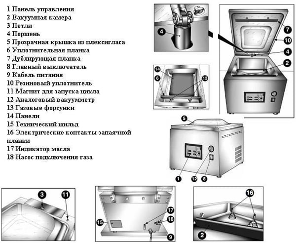 Корпус пакувальної машини виконаний із високоякісної нержавіючої сталі. Пакувальник має опуклу прозору кришку, яка виконана з ABS-пластика, підйом і фіксація якої здійснюється за допомогою газової пружини.