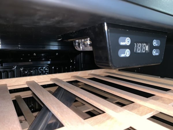 Загартоване тоноване скло запобігає прямому влученню сонячних променів, тим самим оберігає вино від окислення і не дозволяє втрачати своїх колірних якостей. Внутрішнє підсвічування розміщена над верхньою полицею таким чином, щоб світло не впливало на якості та смак вина.