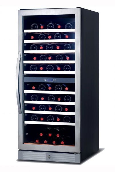 Компактна холодильна шафа з одними дверима вміщує 110 пляшок вина, які розміщуються на 10-ти дерев'яних полицях.