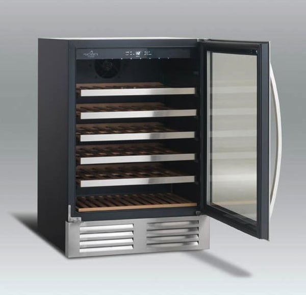 Компактна холодильна шафа з одними дверима вміщує 52 пляшки вина, які розміщуються на п'яти дерев'яних полицях.