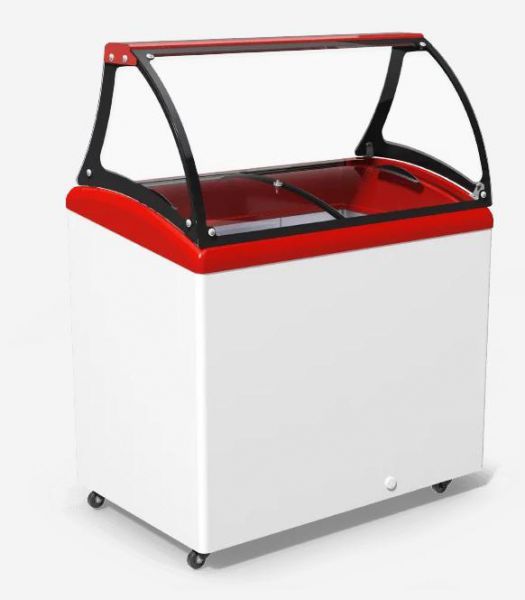 Устаткування оснащене скошеним склом та LED підсвічуванням, комплектується платформами з високоякісної нержавіючої харчової сталі, що дозволяє зручно розмістити ємності з ваговим морозивом.