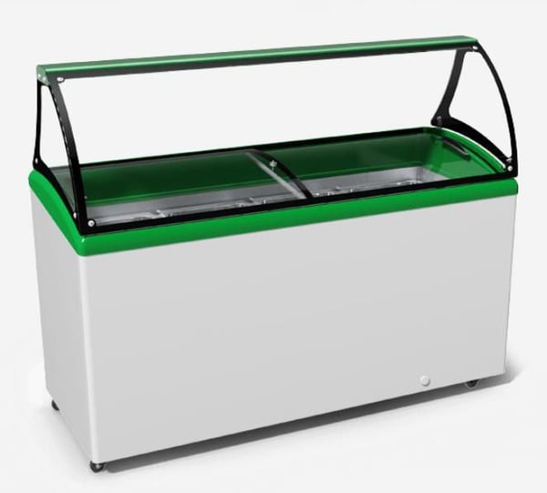 Обладнання оснащене скошеним склом та LED підсвічуванням, комплектується платформами із високоякісної нержавіючої харчової сталі, що дозволяє зручно розмістити ємності з ваговим морозивом.