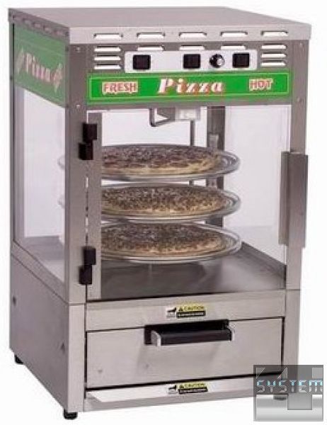 Вітрина з функцією автономної печі для виготовлення охолодженої або замороженої піци діаметром 356 мм. З регульованою опорною рамою. Вітрина обігрівається і підсвічується чотирма лампами розжарювання, розташованими у верхній частині. Площа обігріву контролюється нагрівальним елементом термостата, що не потребує встановлення та регулювання. Повнооглядовий дизайн. Підноси для збору крихт. Поворотна демонстрація.
