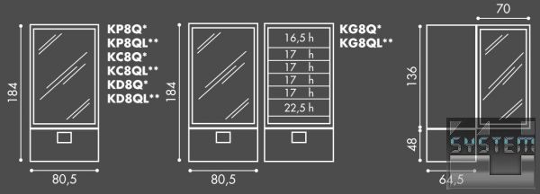 ** KP8QL , KG8QL, KD8QL, KC8QL: нижня структура вітрини виготовлена із спеціальної сталі чорного полірованого кольору, з електронною платою панелі управління з кнопками. Полиці внутрішнього простору вітрини оснащені додатковим світлодіодним підсвічуванням внутрішньої верхньої панелі.