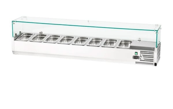 Настільна холодильна вітрина для начинки використовується для попереднього охолодження, демонстрації і короткочасного зберігання заготовок, салатів, закусок, гарнірів в ресторанах, магазинах, барах, суші-барах. Найбільш широко застосовуються в піцеріях для зберігання начинки - начинки для піци.