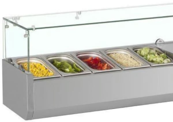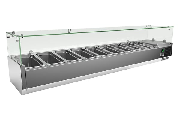 Настільна холодильна вітрина для топінгу використовується для попереднього охолодження, демонстрації та короткочасного зберігання заготовок, салатів, закусок, гарнірів у ресторанах, магазинах, барах, суші-барах. Найбільш широко застосовуються в піцеріях для зберігання топінгу – начинки для піци. Зазвичай вони відокремлюють прилавкову зону від самого залу або розташовуються вздовж лінії самообслуговування. Обладнання виготовлене з високоякісних сертифікованих матеріалів.