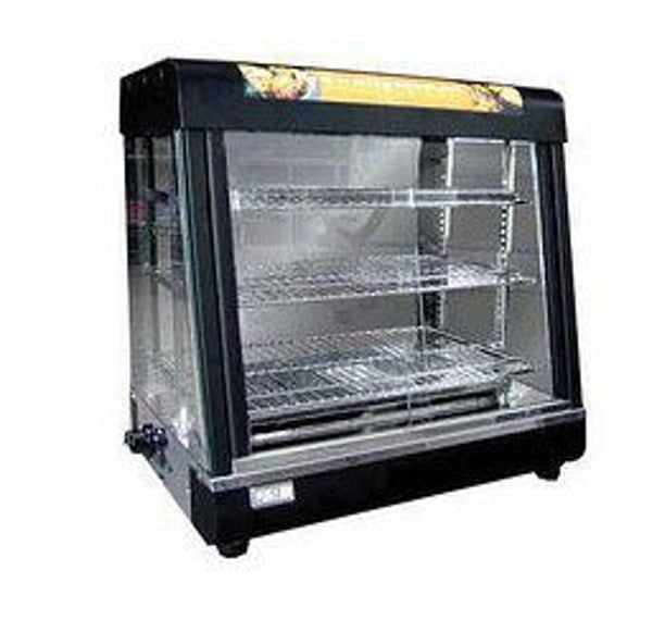 Настільна вітрина забезпечує необхідну температуру від +30 до +85 ° С, має три рівні. Теплова лампа та тени з термостатом. Каркас вітрини виконаний із нержавіючої сталі, скляні дверцята. Лайтбокс розташований зверху. Існує цифровий дисплей.