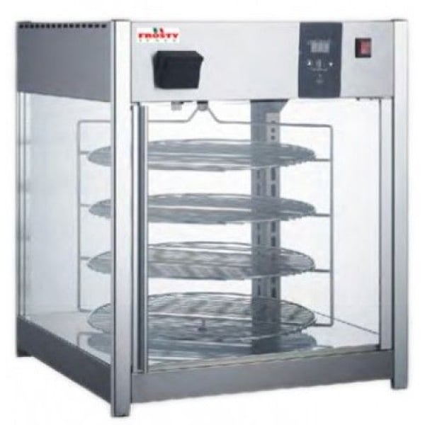 Настільна вітрина для підігріву оснащена світлодіодним підсвічуванням, нагрівачем, який забезпечує необхідну температуру від +30 до +90 °С, також має спеціальний резервуар для води, щоб страви не піддавалися усиханню. Корпус вітрини виконаний з нержавіючої сталі, скло - з чотирьох сторін, чотири хромовані полиці, що обертаються, задні двері вітрини розстібні. Лайтбокс розташований зверху. Є цифровий дисплей та електронний термостат. Об'єм 158 літрів.