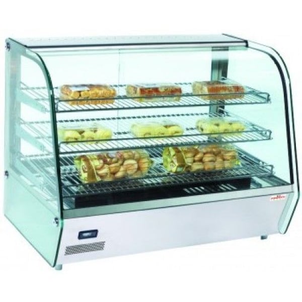 Настільна вітрина для підігріву оснащена світлодіодним підсвічуванням, нагрівачем, що забезпечує необхідну температуру від +30 до +90 °С. Корпус вітрини виконаний з нержавіючої сталі, прозорі стінки з органічного скла, три хромовані полиці. Є цифровий дисплей та електронний термостат. Об'єм 160 літрів