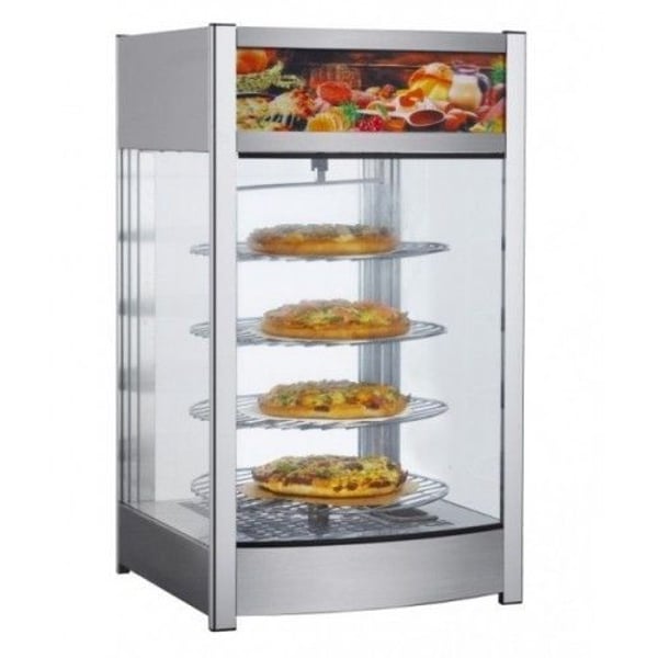 Настільна вітрина для підігріву оснащена світлодіодним підсвічуванням, нагрівачем, який забезпечує необхідну температуру від +30 до +90 °С, також має спеціальний резервуар для води, щоб страву не піддавалися усиханню. Корпус вітрини виконаний з нержавіючої сталі, скло - з чотирьох сторін, чотири хромовані полиці, що обертаються, задні двері вітрини розстібні. Лайтбокс розташований зверху. Є цифровий дисплей та електронний термостат. Об'єм 97 літрів