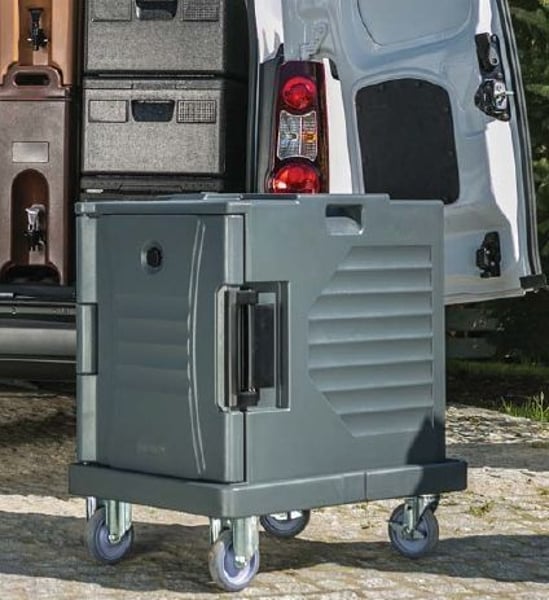 Візок Hendi 877821 використовується для переміщення на підприємствах громадського харчування та на виїзних заходах кейтерингового термоконтейнера Hendi 877814 .