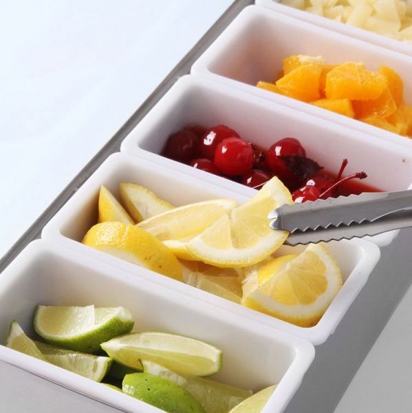 Ящик барний, виконаний з нержавіючої сталі, на 5 лотків із пластику, з прозорою кришкою з поліпропілену, що відкривається вгору. Лотки у комплекті.