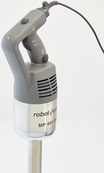 Занурювальний блендер Robot Coupe MP 450 VV Ultra LED - необхідне обладнання для приготування особливих страв чи інгредієнтів та напоїв, що скорочує час приготування майже вдвічі та стане справжнім помічником для кожного кухаря. Можливість використання різних насадок робить занурювальний блендер багатофункціональним пристроєм. Блендер подрібнює та перемішує, робить соуси та пасти, емульсії, фруктові, овочеві та картопляні пюре, джеми, муси, протерті супи, печінкові паштети, рідке тісто для млинців. Завдяки великому об'єму, який можливо обробити, дана модель рекомендується до застосування на підприємствах громадського харчування великого формату, наприклад, в їдальнях, а також на харчових виробництвах.